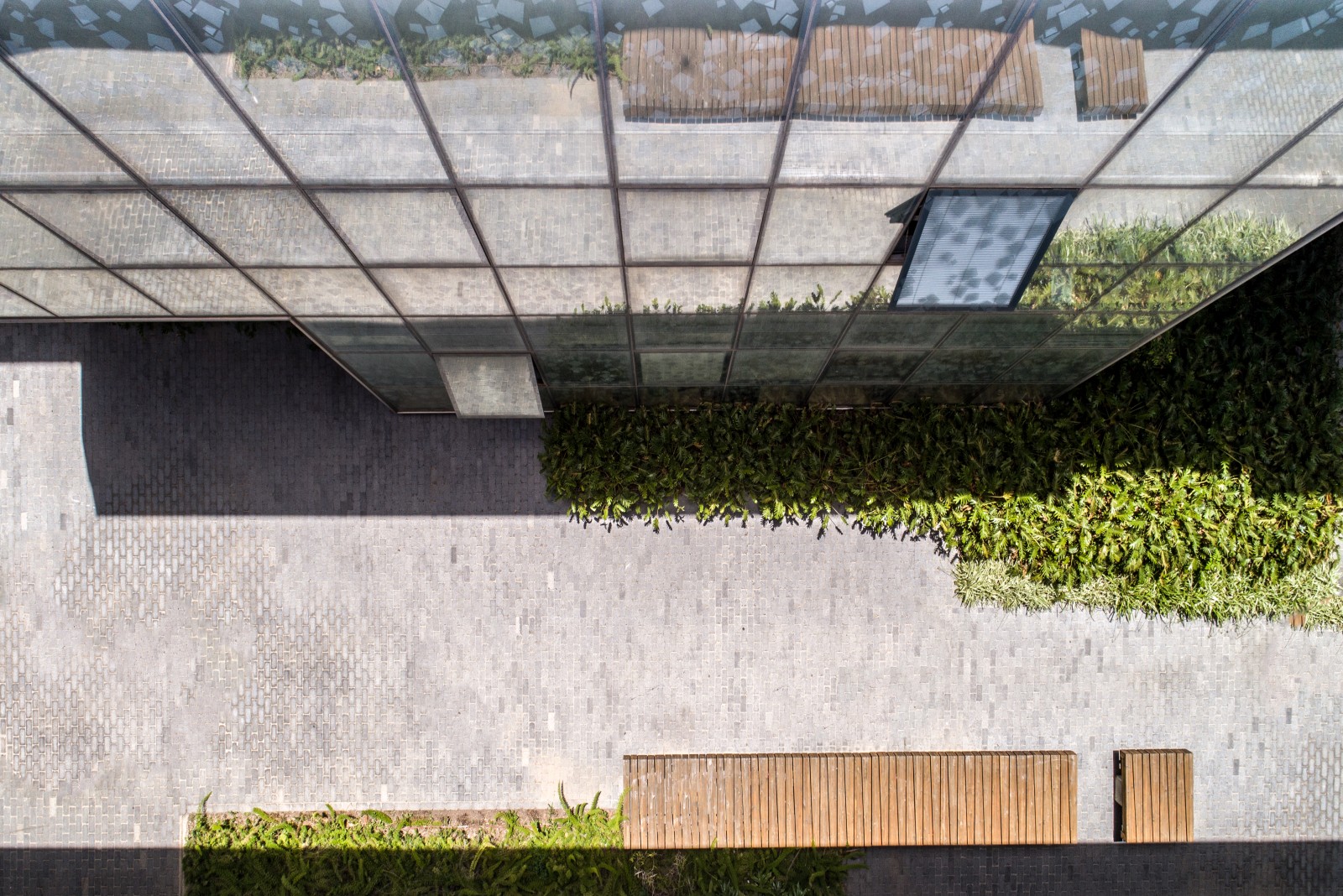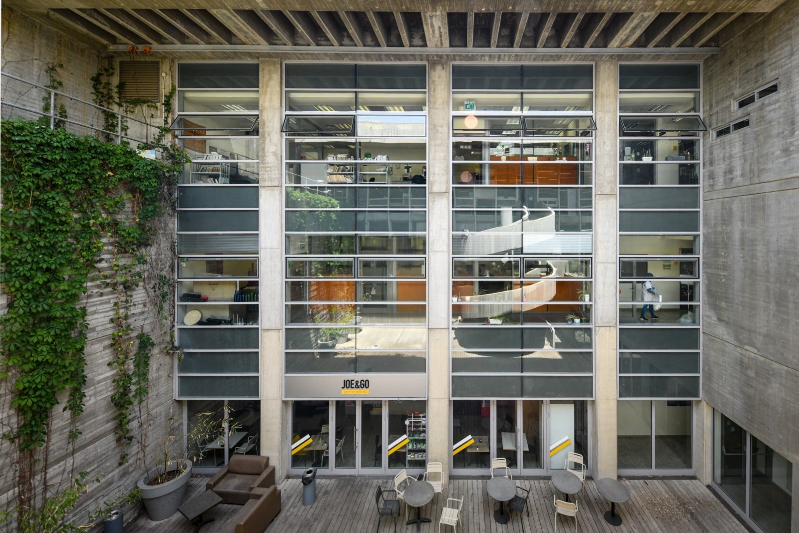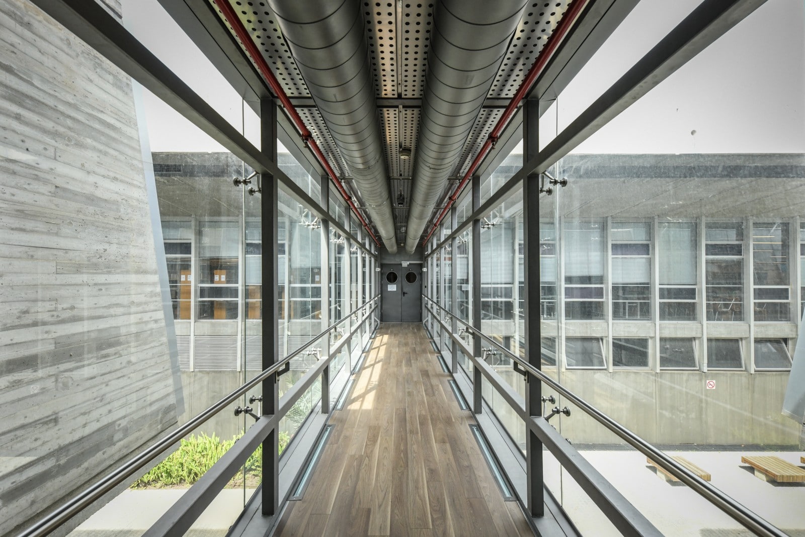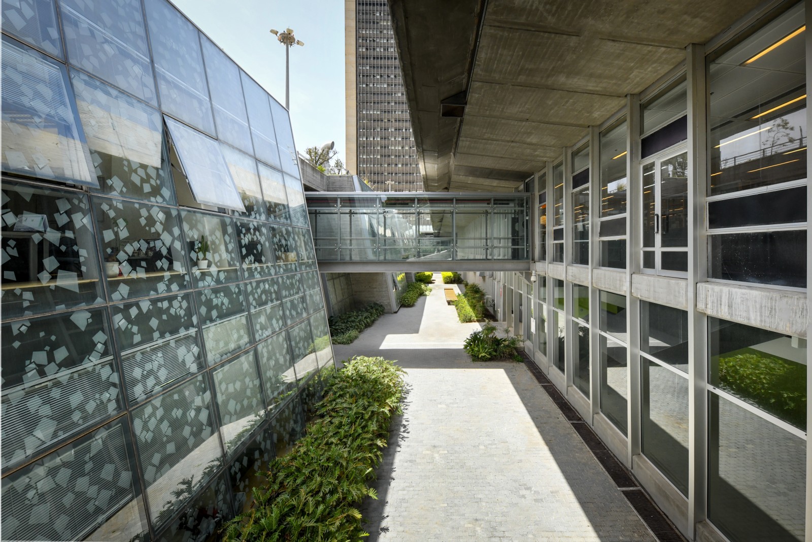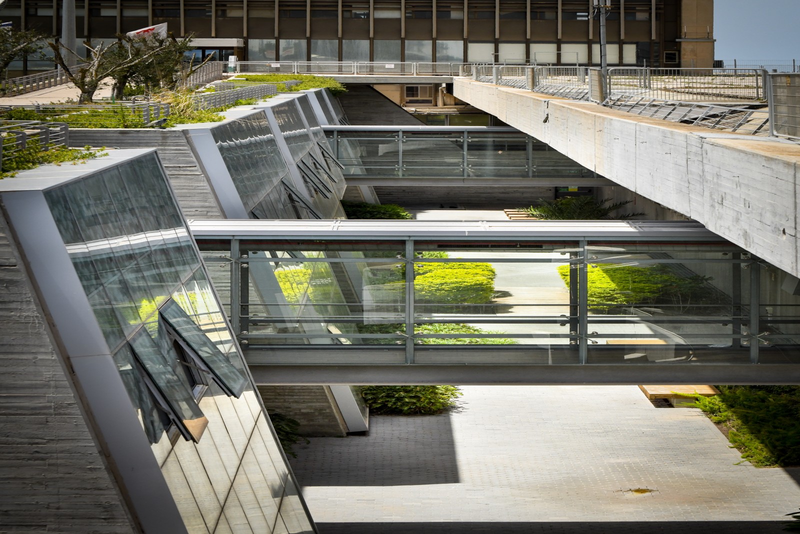 בפרויקט יישמנו מערכות של קירות מסך 8300 SG אשר מורכבות בשיפוע בין מבני הבטון החשוף. בעזרת עיצוב גרפי, הפכנו את עלי המטפס לתצורה גראפית המודפסת כתחרה לבנה על זכוכיות החזית החדשה, ומשמשת כפילטר בין יושבי המשרדים ובין המשתמשים בחלל הציבור.